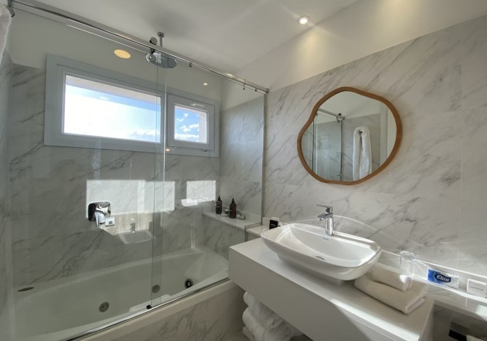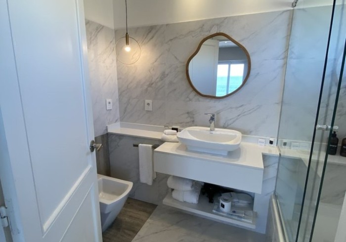 Una mirada privilegiada al Atlántico desde el corazón del diseño. Con una de las vistas más impactantes al océano, esta suite de entre 30 y 52 m² invita a desconectar y reconectar con lo esencial. Ideal para dos personas, su dormitorio principal con cama King se une a un living independiente equipado con un home theater de 55”, creando un ambiente de descanso y entretenimiento único. El vestidor, los placares amplios, el escritorio de trabajo y el diseño de autor con accesorios exclusivos realzan cada detalle, mientras que la Smart TV de 42”, el frigobar y la bañera con hidromasaje completan la experiencia de bienestar. Disfrute de wifi de alta velocidad, aire acondicionado, y cada comodidad pensada para elevar su estadía en Serena Hotel Punta del Este.